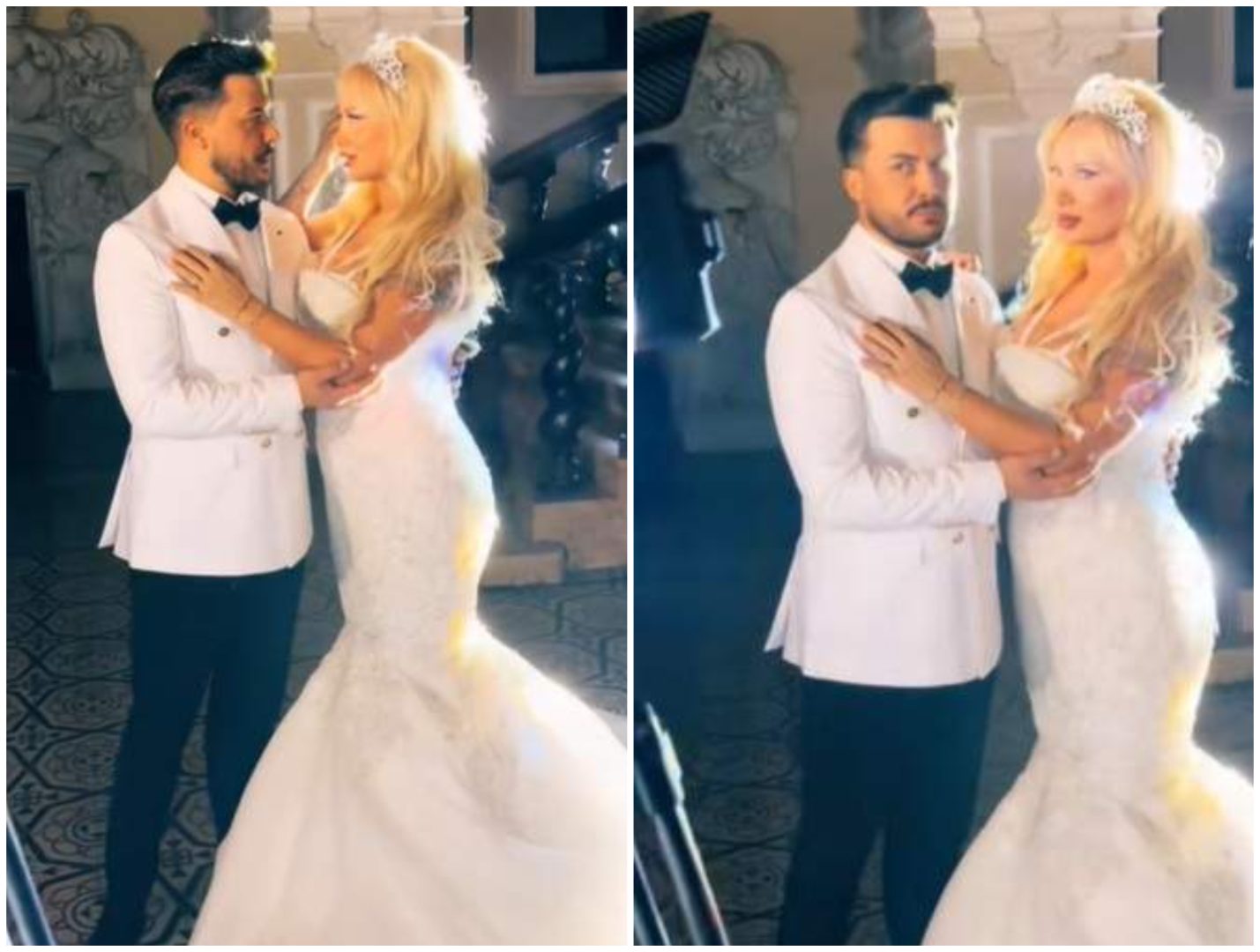 Simona Trașcă poartă o rochie de mireasă extrem de elegantă, mulată pe corp, de tip sirenă, care îi pune în valoare silueta, iar pe cap poartă o diadema strălucitoare. Iubitul ei, Marian, a îmbrăcat un costum cu pantaloni negri și un sacou alb, iar la gât, un papionu negru.