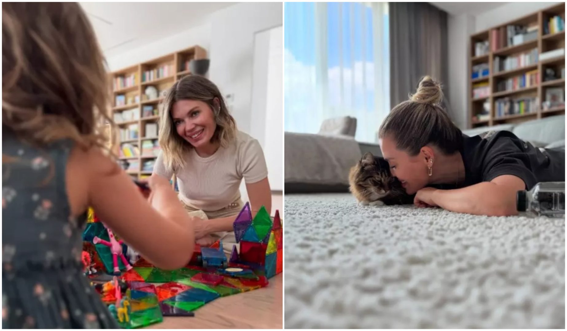Livingul impresionează prin luminozitate, datorită ferestrelor mari, iar pereții în nuanțe de bej creează o atmosferă caldă și aerisită. Un perete este ocupat de o bibliotecă modernă, iar într-un colț a fost amenajat un loc de joacă dedicat fiicei lor.