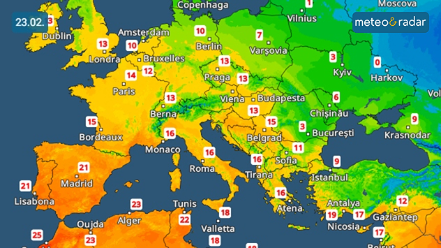 Luni, în sudul Franței, Portugalia și în cea mai mare parte a Spaniei, temperaturile vor urca până la 20–23°C, iar în Andaluzia se pot atinge local chiar și 25°C. În vestul și centrul Europei, precum și în Balcani, maximele vor fi cuprinse între 10 și 17°C.