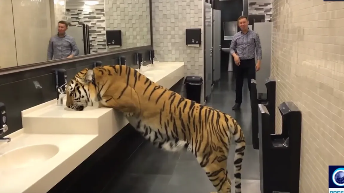 Un tigru într-o toaletă publică nu este un lucru tocmai obişnuit, însă acest fapt este o realitate, după cum ne demonstrează o postare recentă de pe Youtube. Filmarea a fost făcută luni, iar ea ne-o arată pe Chanel, o tigroaică de 7 ani, care se urcă pe chiuvetă şi bea apă, cât se poate de liniştită.