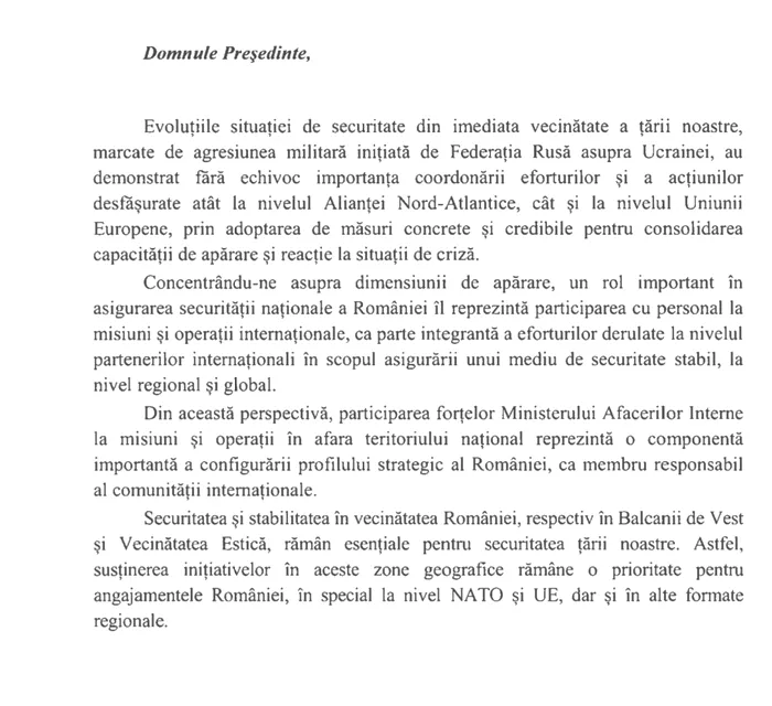 Documentul transmis Legislativului poartă titlul „Scrisoare din partea domnului Nicuşor-Daniel Dan, Preşedintele României privind încuviinţarea, de către Parlamentul României, în temeiul art. 4 alin. (2) din Legea nr. 291/2007, republicată, cu modificările şi completările ulterioare, a unor solicitări ale Prim ministrului României, după consultarea Consiliului Suprem de Apărare a Țării în data de 11 martie 2026”.