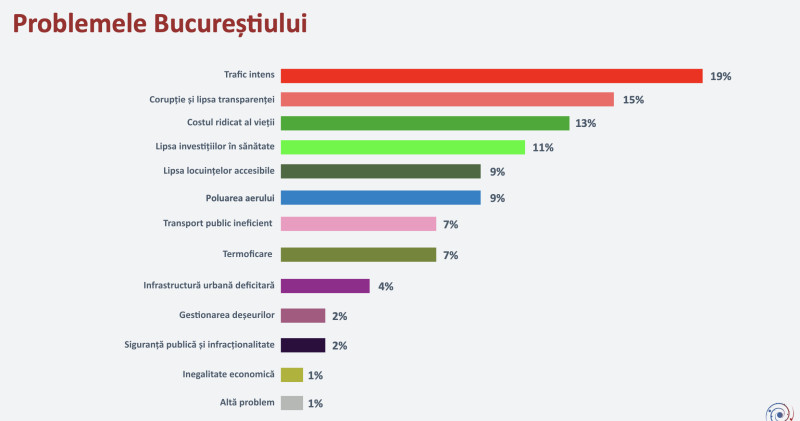 Studiul mai arată cu, principalele probleme cu care se confruntă Bucureştiul, în opinia celor chestionați, sunt: traficul intens – 19%, corupţia şi lipsa transparenţei – 15%, costul ridicat al vieţii – 13%, lipsa investiţiilor în sănătate – 11%, lipsa locuinţelor accesibile şi poluarea – 9%, transportul public ineficient şi termoficarea – 7%, infrastructura urbană deficitară – 4%, gestionarea deşeurilor şi siguranţa publică/infracţionalitatea – 2%.