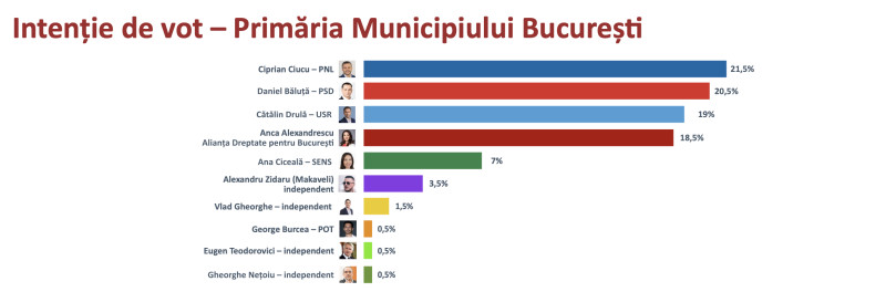 Sondajul îl arată pe Ciprian Ciucu în topul clasamentului, care ar aduna 21,5% din voturi, urmat de Daniel Băluță, cu 20,5%. Candidatul USR, Cătălin Drulă, este pe locul al treilea, la mică distanță, cu 19%, urmat de Anca Alexandrescu, susținută de AUR, cu 18,5%.