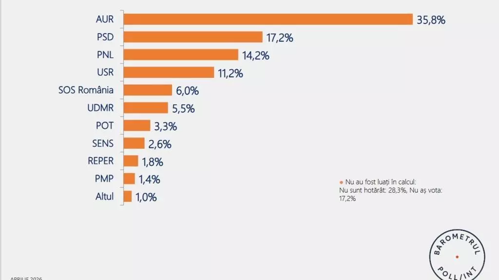 AUR și PSD rămân primele două partide ale țării potrivit Barometrului Poll/Int, realizat de Agenția de Rating Politic, însă într-o ordine inversată față de cea din prezent.