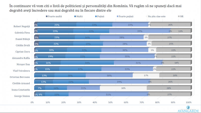 Robert Negoiță este politicianul sau personalitatea bucureșteană cu cel mai mare procent de oameni care au spus că au „multă” încredere în el sau ea (25%). Primarul Sectorului 3 este urmat de colegii săi social-democraţi Gabriela Firea (23%) și Daniel Băluță (23%).