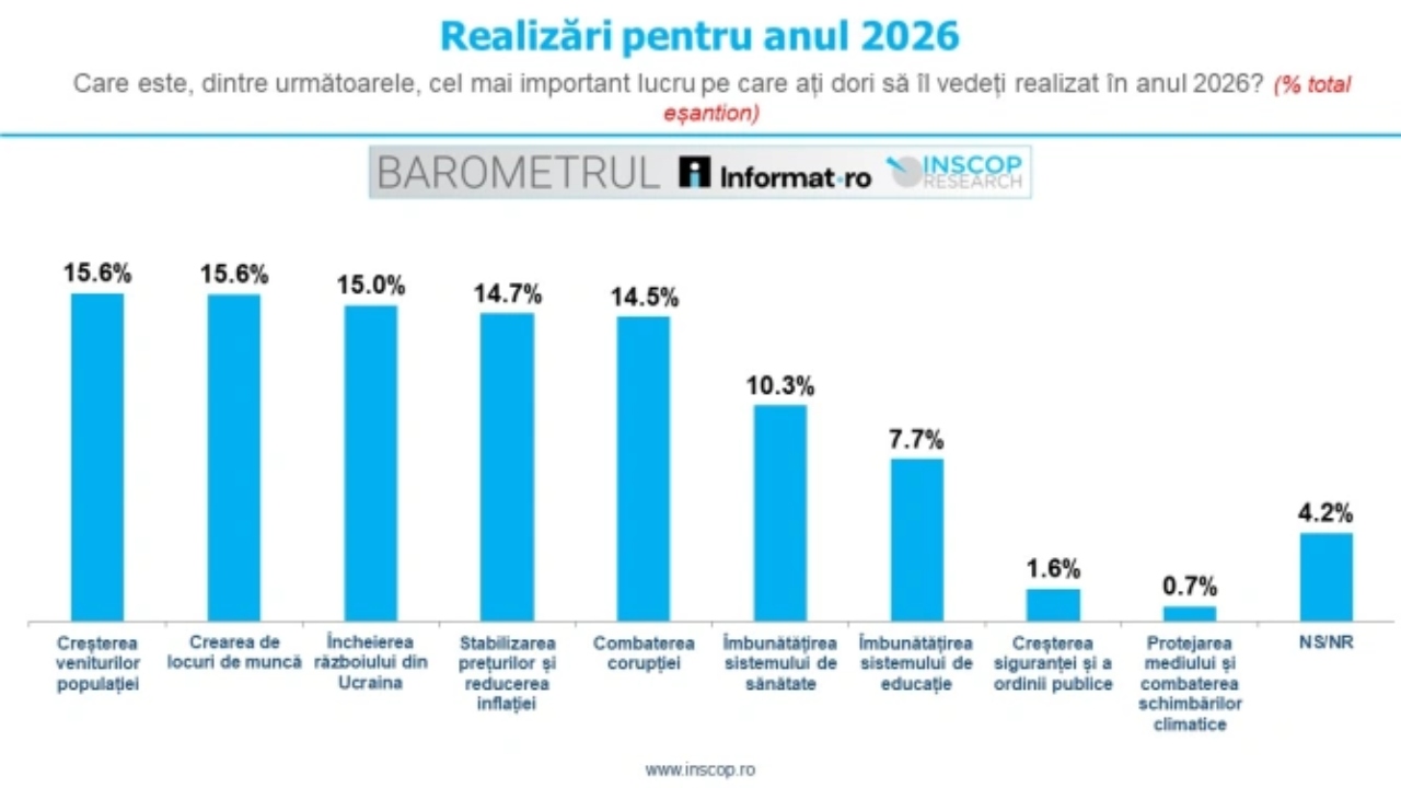 Întrebați care este cel mai important lucru pe care ar dori să îl vadă realizat în anul 2026, 15.6% dintre respondenți menționează creșterea veniturilor, 15.6% crearea de locuri de muncă, iar 15% încheierea războiului din Ucraina.
