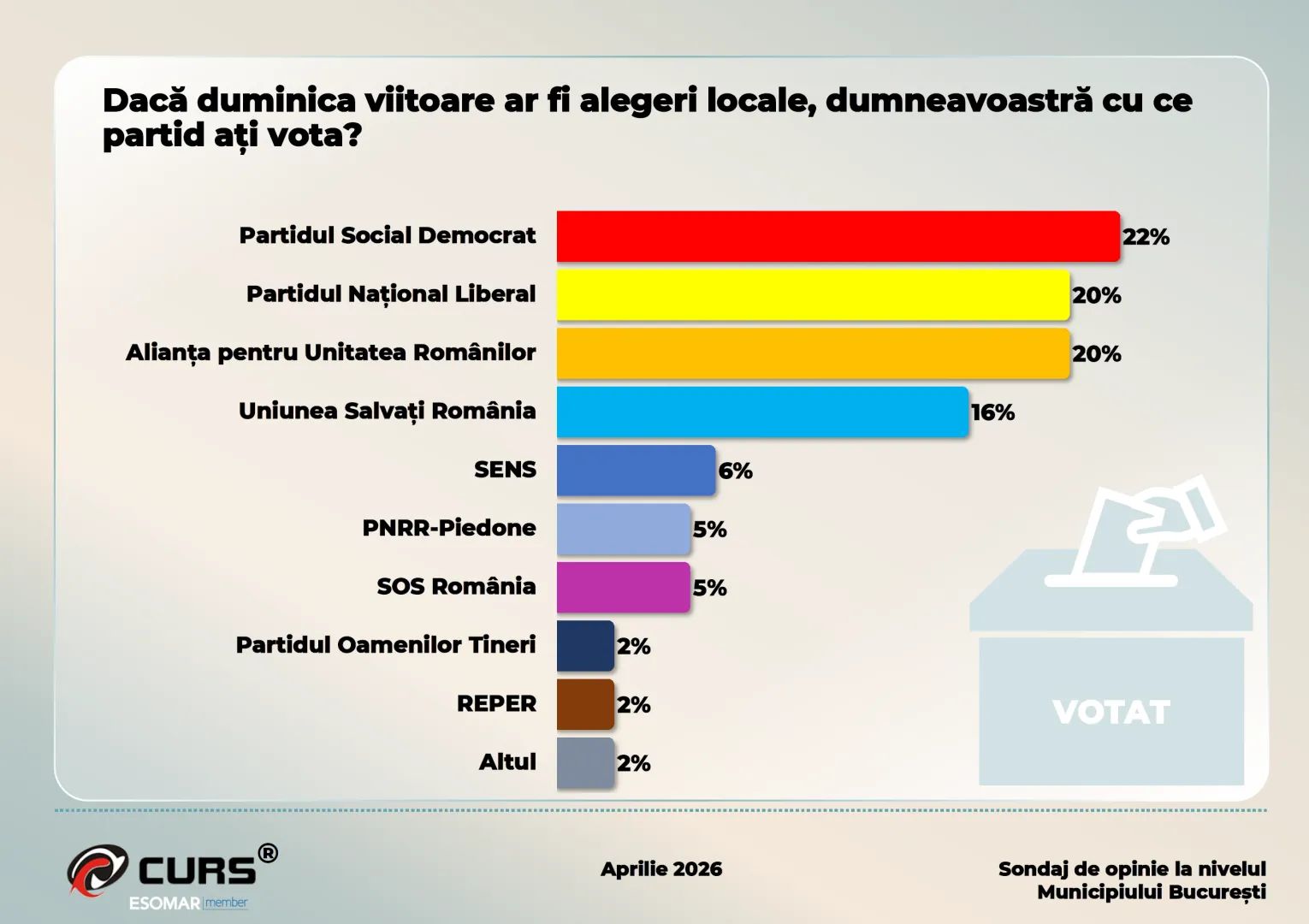 Foarte interesant în sondaj este opțiunea de vot, știut fiind că Bucureștiul nu este un fief al social democraților. De această dată, PSD ar obține 22% din voturi, PNL 20% și AUR 20%, urmate de USR cu 16%. SENS ar avea 6%, PNRR-Piedone 5%, SOS România 5%, Partidul Oamenilor Tineri 2%, REPER 2% iar alte opțiuni 2%.
