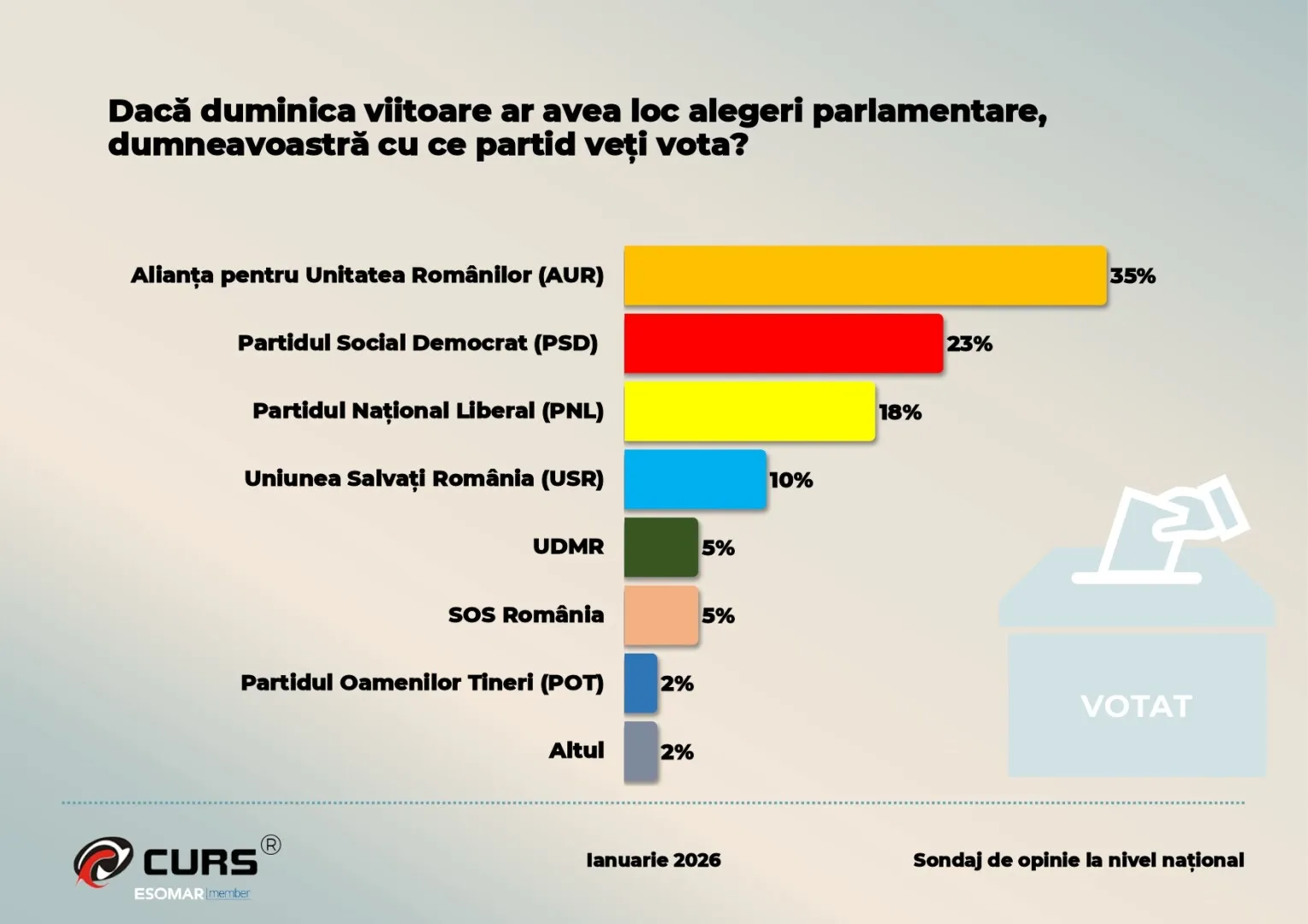 Sondaj CURS, ianuarie 2026: AUR își consolidează prima poziție, dar partidele din coaliție au încă majoritate. Partidul Social Democrat este creditat cu 23% din voturi, menținându-se pe poziția a doua, în timp ce Partidul Național Liberal ar obține 18%. Uniunea Salvați România ar întruni 10% din opțiunile electorale.