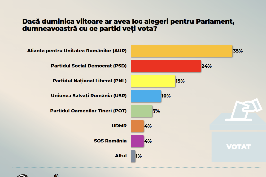 Dacă duminica viitoare ar avea loc alegeri pentru Parlament, 35% dintre români ar vota cu Alianţa pentru Unitatea Românilor (AUR), 24% cu Partidul Social Democrat (PSD), 15% cu Partidul Naţional Liberal (PNL), 10% cu Uniunea Salvaţi România (USR) şi 7% cu Partidul Oamenilor Tineri (POT).
