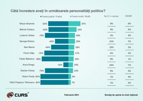 Sondaj CURS. Potrivit cercetării sociologice, pe primul loc în topul încrederii se află Klaus Iohannis, cu 37% încredere multă şi foarte multă, dar şi cu 63% încredere puţină şi foarte puţină. Pe locul doi şi trei se află Marcel Ciolacu, preşedintele PSD, cu 25%, şi Ludovic Orban, preşedintele PNL, cu 20%.