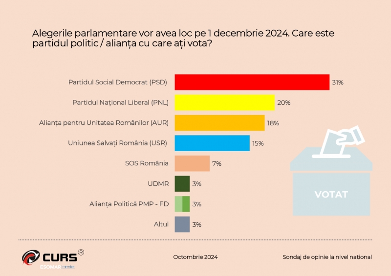 Cel mai recent sondaj la nivel național arată că PSD și PNL ar putea fi obligate să guverneze împreună și după alegerile parlamentare, chiar dacă PSD ar avea și alternativa AUR pentru o majoritate parlamentară. Potrivit sondajului omnibus de tip CATI realizat de Centrul de sociologie urbană și regională – CURS în perioada 11-16 octombrie 2024, PSD conduce în preferințele electoratului, urmat de PNL și AUR.