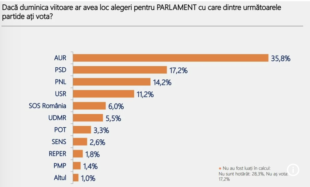 Sondajul indică și un procent de 28,3% de respondenți indeciși și 17,2% care declară că nu ar vota.