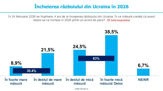 Datele INSCOP arată faptul că aproximativ trei din zece respondenți cred că războiul s-ar putea încheia în 2026 printr-un acord de pace. În același timp, un număr mare de persoane consideră că acest lucru este puțin probabil sau chiar imposibil într-un termen atât de scurt.