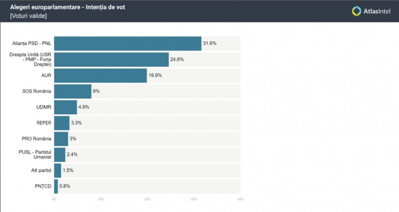 Sondajul a fost realizat în perioada 5-9 aprilie și arată rezultate surprinzătoare pentru coaliția PSD-PNL dar și pentru Alianța Dreapta Unită, care depășește partidul AUR. Partidul Dianei Șoșoacă intră în Parlamentul European.