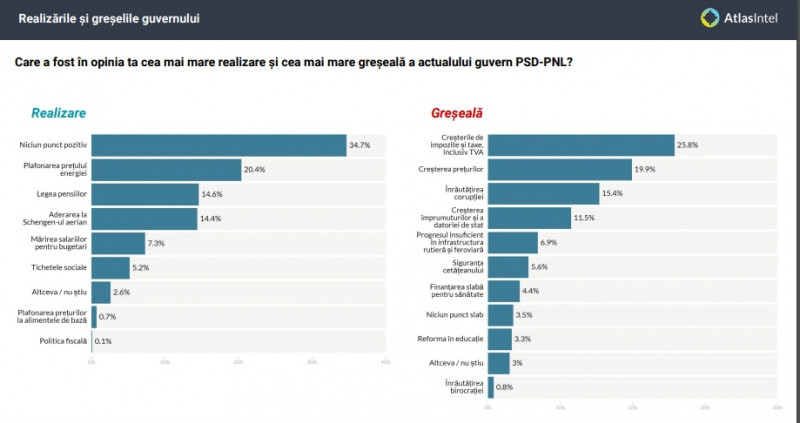 Românii văd creșterea taxelor ca fiind cea mai mare greșeală a guvernului PSD-PNL, în timp ce 34,7% nu văd nicio realizare pozitivă a actualilor guvernați. Totuși, 20% sunt de părere că plafonarea prețurilor în energie este principala realizare a guvernului, iar legea pensiilor este apreciat de 14,6%. Și aderarea parțială la Schengen este văzută ca un lucru bun de 14,4%.