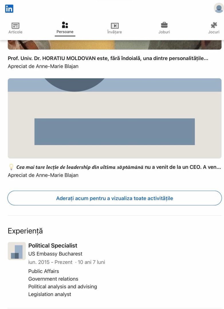 Că asta nu ar fi tot, Anne-Marie Blăjan este critică chiar și la adresa lui Donald Trump, în ciuda faptului că lucrează pentru o legație a statului american. Blăjan apreciază în mod deschis de pe pagina de LinkedIn care arată poziția sa oficială ca angajat al ambasadei articole anti-Trump.