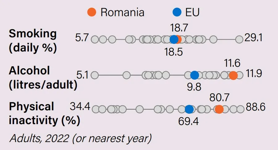 Conform unui raport făcut public de Comisia Europeană, speranța de viață din România rămâne printre cele mai scăzute din Uniunea Europeană. Consumul de alcool rămâne cel mai ridicat din UE, iar majoritatea adulților nu fac suficient sport. În timp ce rata de fumat este mai apropiată de media UE, utilizarea țigărilor electronice în rândul tinerilor este în creștere. Potrivit raportului, 30% dintre decesele din 2021 au fost cauzate de alimentație deficitară, fumat, consum de alcool și lipsa activității fizice. Alte 6% dintre decese au fost asociate cu poluarea aerului.