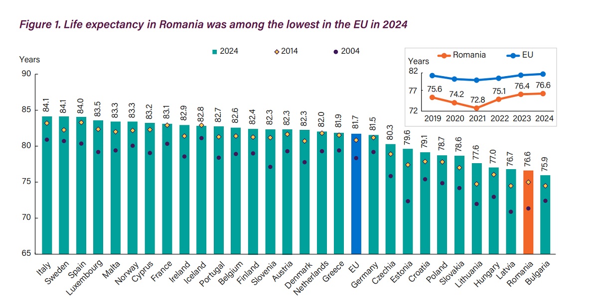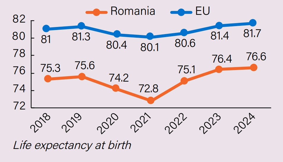 Raportul făcut public de Comisia Europeană consemnează „îngrijorări deosebite cu privire la oferta actuală şi viitoare de medici de familie”. Potrivit raportului, după scăderea bruscă din timpul pandemiei de COVID-19, speranța de viață și-a revenit, atingând un nou record de 76 de ani în 2024, însă este în continuare cu peste cinci ani sub media UE.