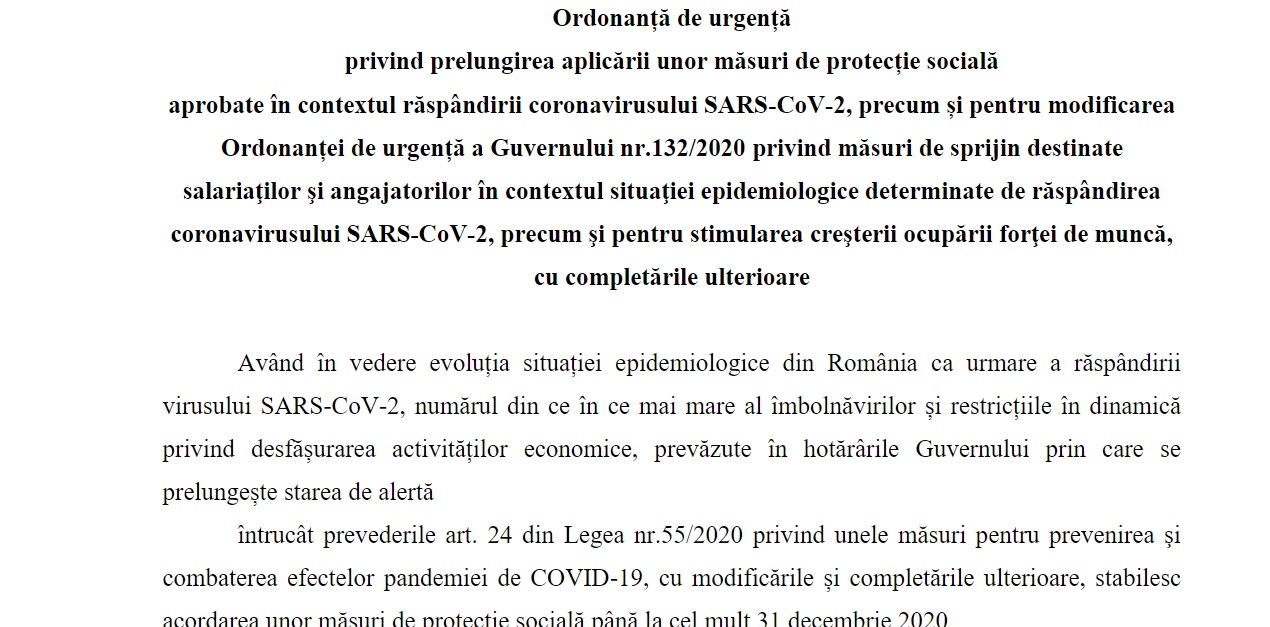 “Având în vedere evoluția situației epidemiologice din România ca urmare a răspândirii virusului SARS-CoV-2, numărul din ce în ce mai mare al îmbolnăvirilor și restricțiile în dinamică privind desfășurarea activităților economice, prevăzute în hotărârile Guvernului prin care se prelungește starea de alertă, întrucât prevederile art. 24 din Legea nr.55/2020 privind unele măsuri pentru prevenirea şi combaterea efectelor pandemiei de COVID-19, cu modificările și completările ulterioare, stabilesc acordarea unor măsuri de protecție socială până la cel mult 31 decembrie 2020, întrucât este necesar să fie asigurate măsuri de protecție socială pentru angajați, angajatori și alte categorii de profesioniști în concordanță cu situația epidemiologică, în situația în care starea de alertă se va prelungi și după 31 decembrie 2020“