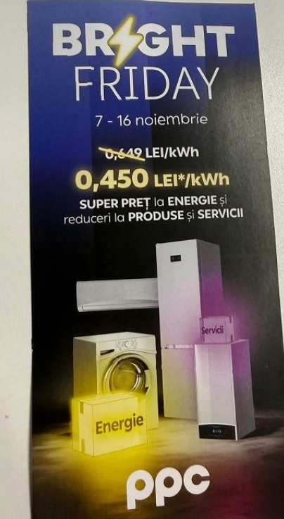 Oferta, lansată sub numele Bright Friday, este valabilă în perioada 7-16 noiembrie și vizează doar clienți noi. PPC nu precizează că ar exista o limită a numărului de contracte care pot fi încheiate pentru această ofertă. Prețul rămâne neschimbat timp de un an, perioadă pentru care se semnează contractul de furnizare a energiei electrice, notează economica.net.