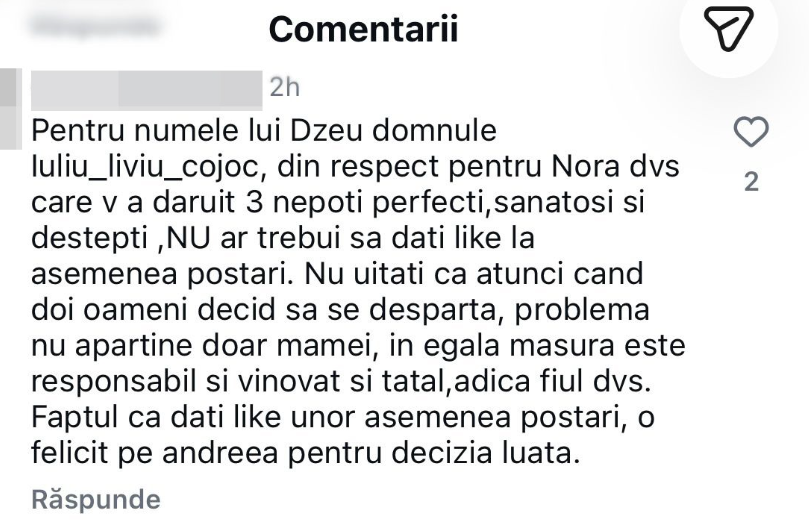 În secțiunea de comentarii, opiniile au fost împărțite. Unii internauți au criticat gestul, considerând că nu este potrivit, în timp ce alții au luat apărarea Andreei Popescu. Un mesaj în mod special i-a atras atenția tatălui lui Rareș. Acestuia i s-a sugerat că ar trebui să manifeste mai mult respect față de fosta noră, mai ales că aceasta i-a oferit trei nepoți.