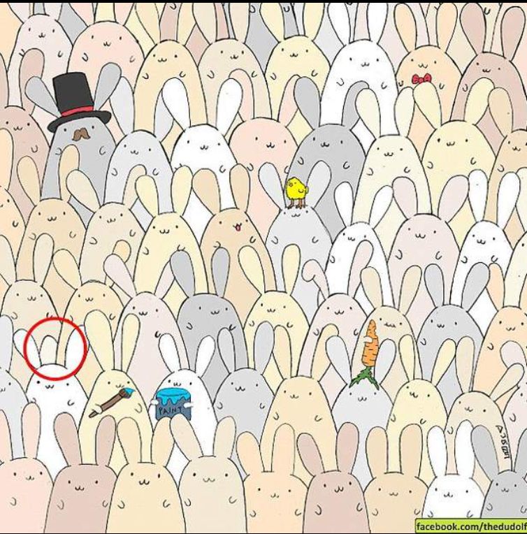Cu toate că aparent pare greu, în realitate tot ce trebuie să faceți este să vă concentrați puțin. Aveți la dispoziție doar cinci secunde să indentificați oul cu pricina. Printre iepurii de culoare crem, se află un ou în aceeași nuanță. L-ai văzut? Ei bine, dacă nu ai reușit să îl identifici venim în ajutorul tău. Oul se află pe rândul al patrulea în partea stângă. Dacă nu ai reușit să îl observi, nu este nicio problemă. Data viitoare te vei concentra mai bine și cu siguranță vei reuși.