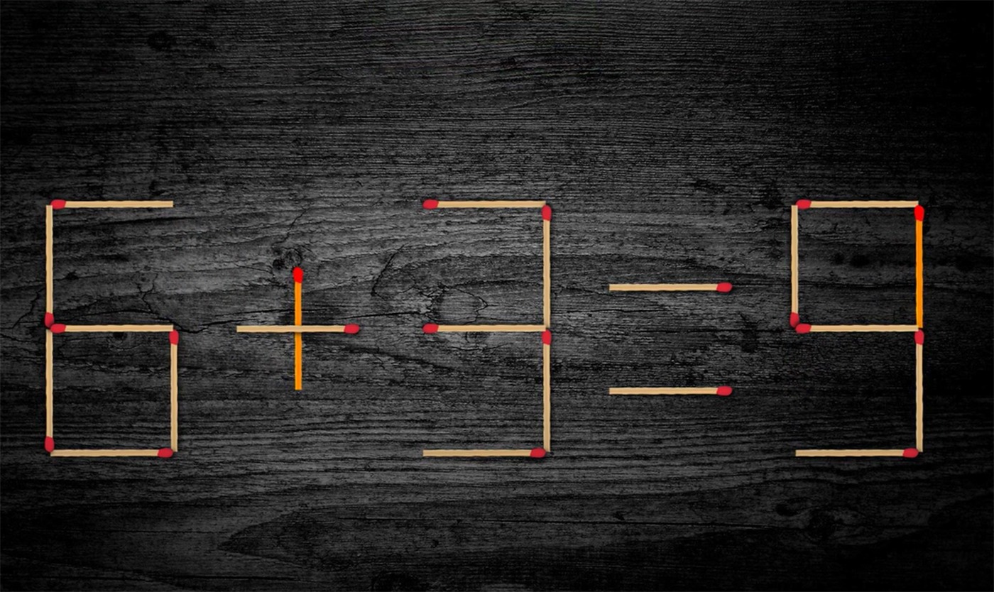 Dacă nu ai reușit să găsești rezolvarea din două mișcări, nu își face griji, te vom ajuta. Pentru a ajunge la acest rezultat 6 + 3 = 9, mută un băț din cifra „8” pentru a forma „6”. Mută alt băț din semnul „-” pentru a-l transforma în semnul „+”.