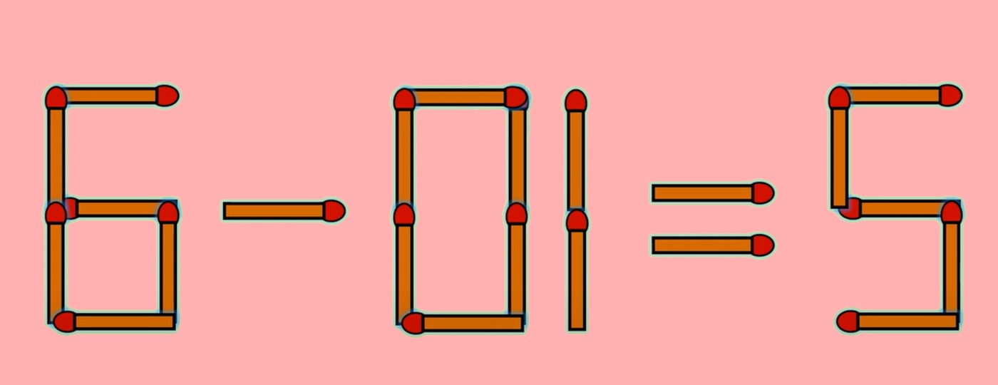 Rezolvare: Așadar, 6 – 61 = 5 este greșit, iar pentru a corecta egalitatea trebuie să mutați bățul de chibrit așezat orizontal, cel care formează cifra 6, în poziție verticală, în componența aceleiași cifre. Astfel, veți obține 6 – 01 = 5. Iată ecuația corectă!