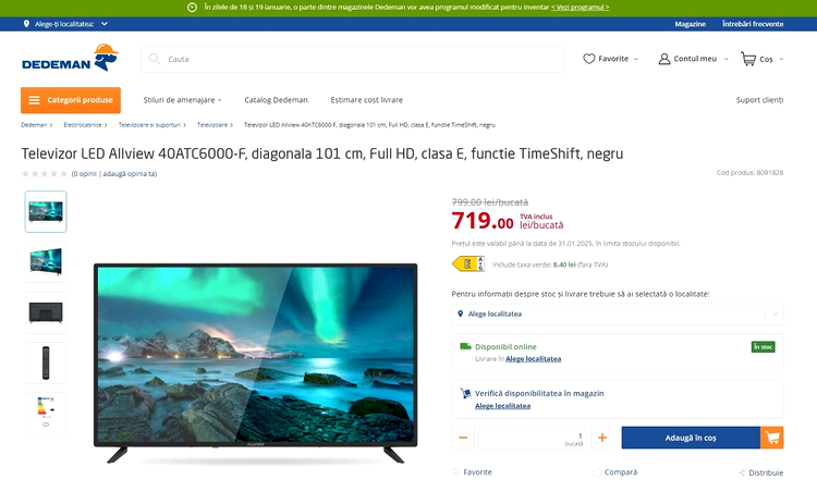Dedeman lansează o ofertă specială în perioada 1-31 ianuarie 2025, prin care mai multe produse sunt scoase la reducere. Dintre acestea, am selectat trei televizoare care sunt perfecte pentru orice locuință și gata să vă redea cele mai frumoase filme.