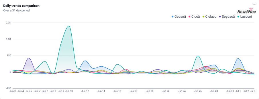 În ce privește trendul de accelerație – adică ritmul crescut de mențiuni comparativ cu perioada anterioară – se remarcă ascensiunea Elenei Lasconi la momentul alegerilor din 9 iunie, când a înregistrat o accentuare a volumului de mențiuni generate în jurul numelui său. În graficul de mai jos, se vede de asemenea și influența scandalului acuzațiilor de plagiat la adresa lui Mircea Geoană (vârful curbei albastre în jurul datei de 1 iulie).