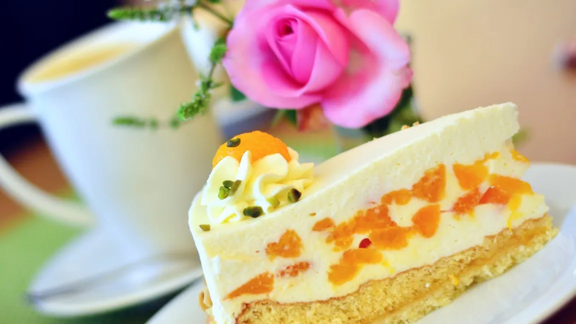 La final, peste frisca batuta se pune iaurtul amestecat cu zaharul, esente si gelatina ce s-a topit. Se amesteca. Intr-un recipient (eu fac in tava de copt blatul de tort) capitonat cu folie din plastic se asaza felii de piersica taiata subtire se toarna 1/2 din compozitia rezultata se pun un rand de piscoturi inmuiate in zeama de compot, iar peste se toarna restul compozitiei in care sa adaugat putina esenta de rom si cele 3 linguri de cacao.