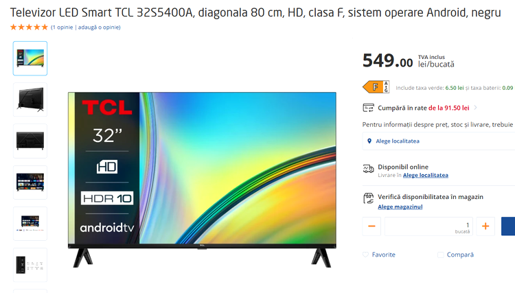 Un televizor ceva mai scump, dar tot sub pragul de 600 de lei, este TCL 32S5400A, singurul din această listă care intră în categoria Smart. Cu o diagonală de 80 de centrimetri și sistem de operare Android TV, acest model permite acces direct la aplicații populare precum YouTube sau Netflix, fără a fi necesare dispozitive externe.