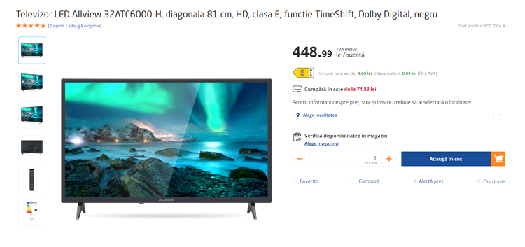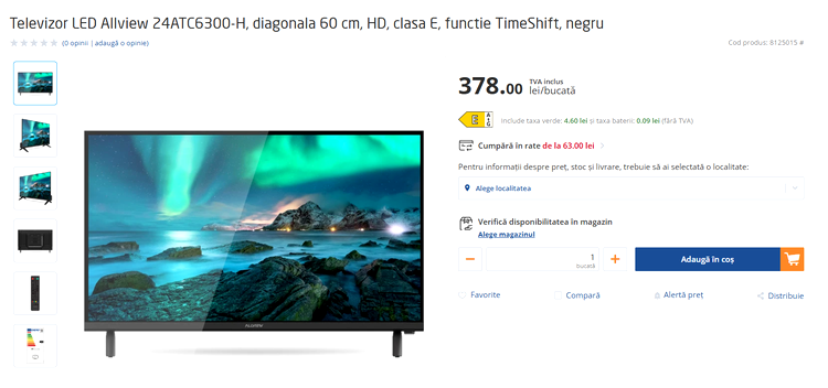 Cel mai accesibil model este Allview 24ATC6300-H, cu un preț de doar 378 de lei, un televizor cu diagonală de 60 de centrimetri, gândit pentru spații mic sau utilizare secundară. Modelul nu itrăîn categoria Smart TV și se bazează exclusiv pe recepția clasică prin cablu sau antentă, având tunere digitale pentru standardele DVB-C și DVB-T2.