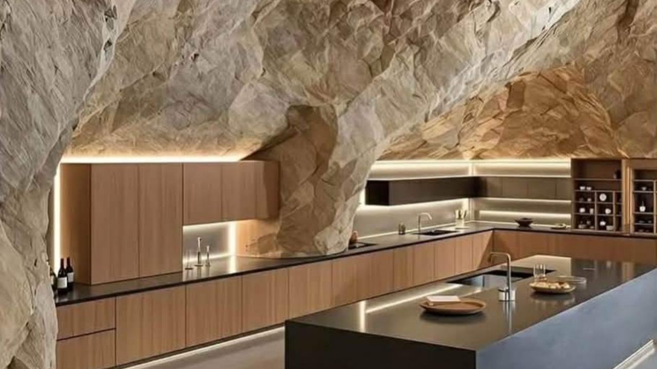 În bucătărie, mobila a fost amenajată într-o zonă de curbură a peșterii, iar culorile pe care cei doi soți le-au ales sunt maro deschis și negru pentru blat.