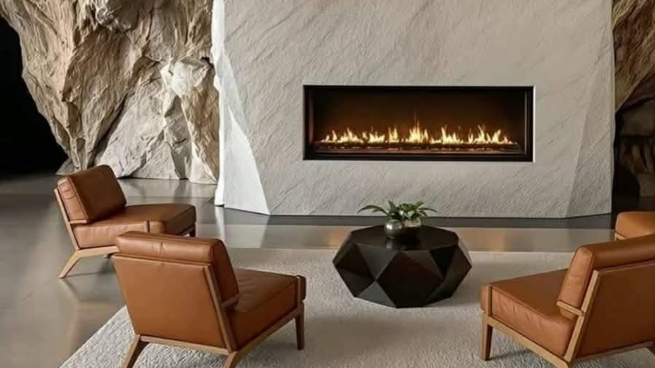 Cu toate că locuința a fost amenajată într-o peșteră, cei doi soți au ales pentru living două canapele albe și moderne, iar între cele două a fost așezată o masă de culoare deschisă, pentru a oferi un plus de confort. Livingul a fost decorat și cu un șemineu, în fața căruia au fost puse mai multe scaune.