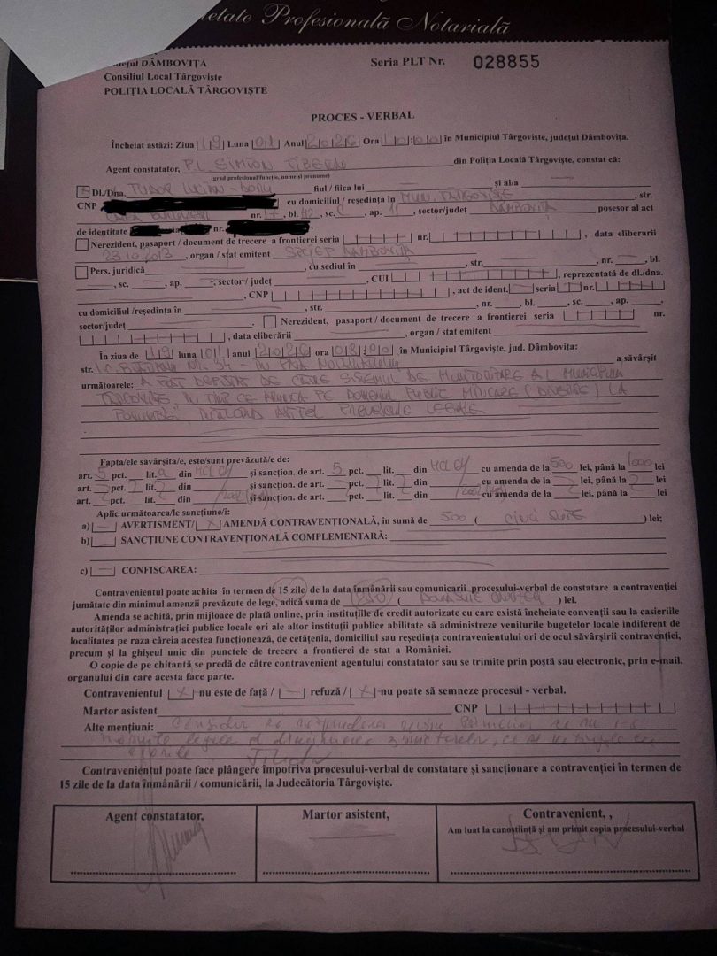 „Mulțumesc primăriei Târgoviște și în special poliției locale fiind sancționat contravențional astăzi data de 19-01-2026 orele 10:00, pentru grava contravenție săvârșită în jurul orelor 08:00, în timp ce aruncam pe domeniul public mâncare (diverse) la porumbei, încălcând astfel prevederile legale (am citat din procesul verbal prin care am fost sancționat cu o amendă de 500 lei)