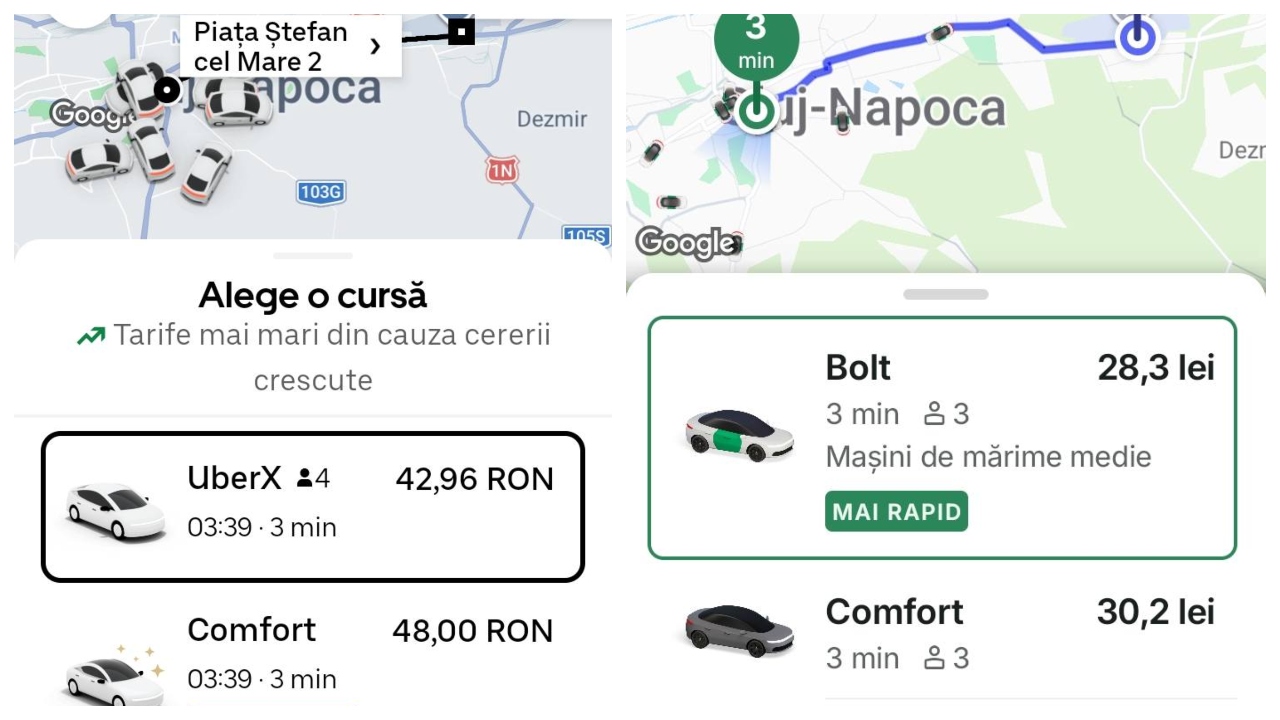 Din dorința de afla dacă și cu cât diferă tarifele cerute de Uber și Bolt pentru același traseu, cineva a realizat recent un așa-zis experiment. Aflată în Cluj-Napoca, respectiva persoană a verificat cât ar avea de plătit celor două companii, la aceeași oră, pentru o cursă pe traseul centru-Aeroportul Internațional ”Avram Iancu” (distanța aproximativă – opt kilometri).