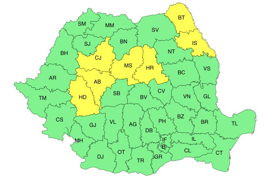 În județele Botoșani, Iași, Harghita, Mureș, Cluj, Alba și Hunedoara, vor continua să se înregistreze temperaturi deosebit de scăzute (în medie cu 5…9 grade mai mici decât cele normale datei), cu valori ce se vor încadra între -8 și -4 grade, mai scăzute până în jurul a -10 grade, pe văi și în depresiuni, unde gerul va persista.