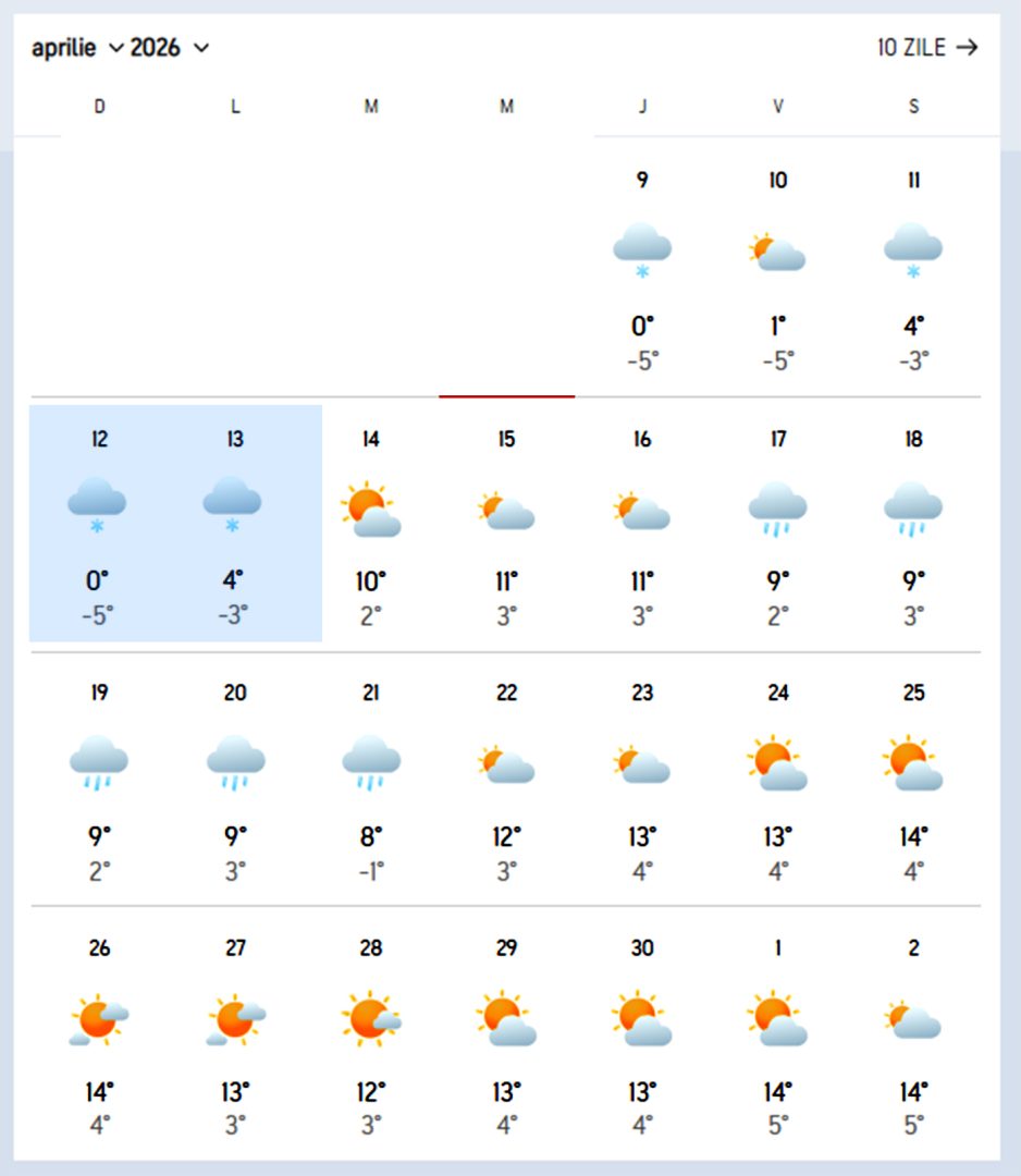 -Între 17 și 21 aprilie 2026 sunt anunțate ploi. Temperatura maximă se va situa între 8-9 grade Celsius. Noaptea, temperaturile vor fi între -1 și 3 grade.