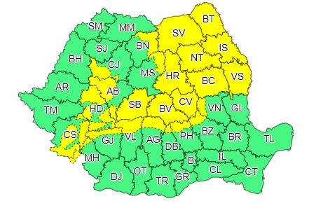 COD GALBEN de ninsori însemnate cantitativ, intensificări ale vântului în sudul și estul Transilvaniei, nordul și centrul Moldovei și zona de munte.