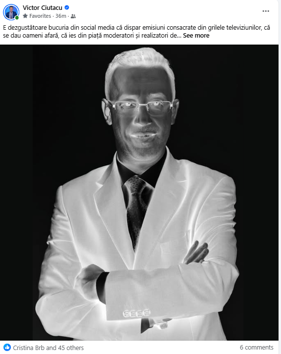 Victor Ciutacu, Dan Negru şi Florin Călinescu au comentat debarcarea lui Cătălin Măruţă de la Pro Tv. „E dezgustătoare bucuria din social media că dispar emisiuni consacrate din grilele televiziunilor, că se dau oameni afară, că ies din piață moderatori și realizatori de emisiune care chiar lasă urme în industrie. Nu vă plac Capatos și Măruță, nu vă uitați. D-aia n-aveți voi pulover pe gât, că stau ăia doi în geam de-o veșnicie.