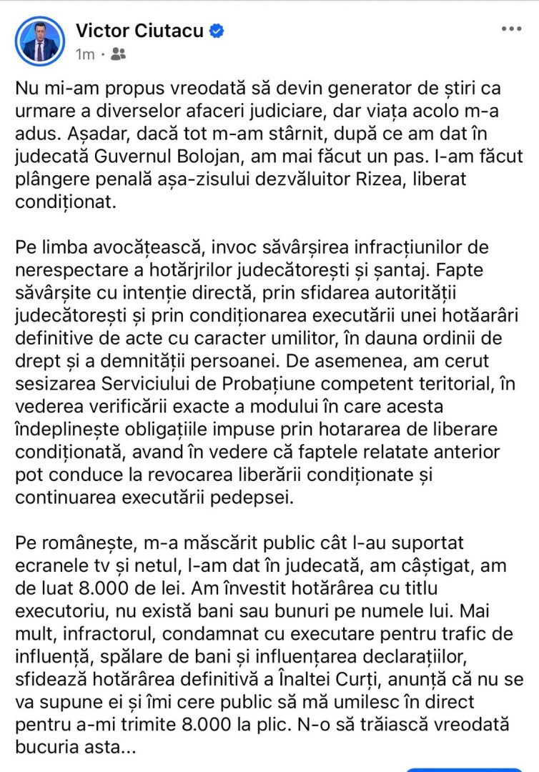 „Pe românește, m-a măscărit public cât l-au suportat ecranele tv și netul, l-am dat în judecată, am câștigat, am de luat 8.000 de lei. Am învestit hotărârea cu titlu executoriu, nu există bani sau bunuri pe numele lui. Mai mult, infractorul, condamnat cu executare pentru trafic de influență, spălare de bani și influențarea declarațiilor, sfidează hotărârea definitivă a Înaltei Curți, anunță că nu se va supune ei și îmi cere public să mă umilesc în direct pentru a-mi trimite 8.000 la plic. N-o să trăiască vreodată bucuria asta…”, a mai scris Victor Ciutacu pe Facebook.
