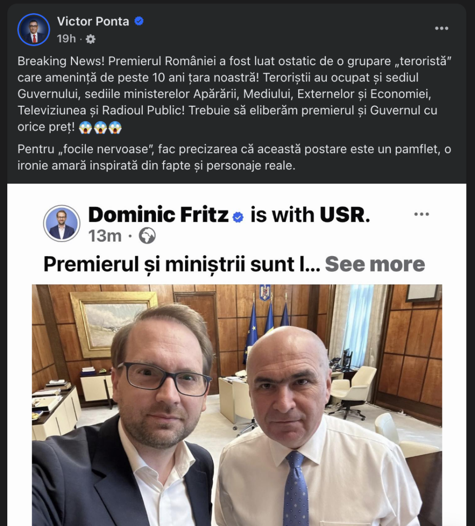 Fostul premier Victor Ponta a lansat un pamflet pe pagina sa de Facebook, în care compară USR cu o „grupare teroristă” care l-a luat „ostatic” pe premierul Ilie Bolojan, motiv pentru care românii și politicienii trebuie să „elibereze” premierul și Guvernul.