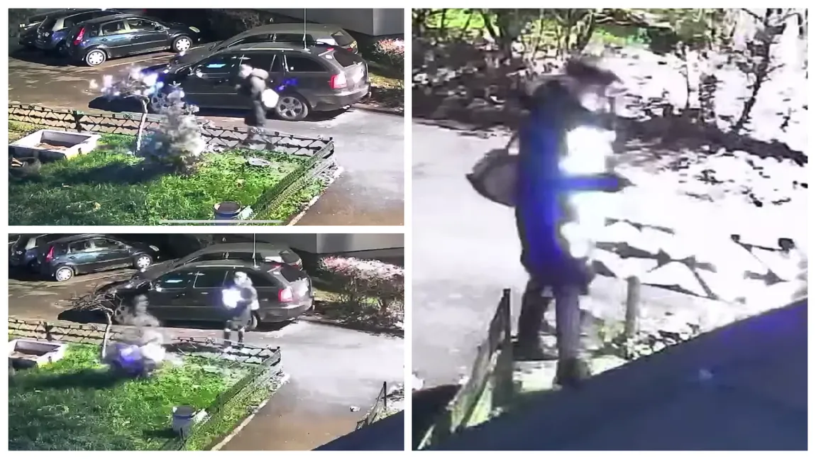 În imagini se vede cum bărbaul se plimbă prin fața blocului, pentru a se asigura că nu este văzut, apoi ia repede instalațiile și dispare. Tânărul era pregătit, având cu el o geantă în care să transporte instalațiile luminoase.