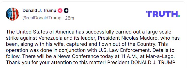 UPDATE: SUA au efectuat atacuri la scară largă asupra Venezuelei, încununate de succes, iar liderul acestei țări, Nicolas Maduro, și soția sa, au fost capturați și scoși din țară pe calea aerului, a declarat sâmbătă președintele american Donald Trump, citat de Reuters.