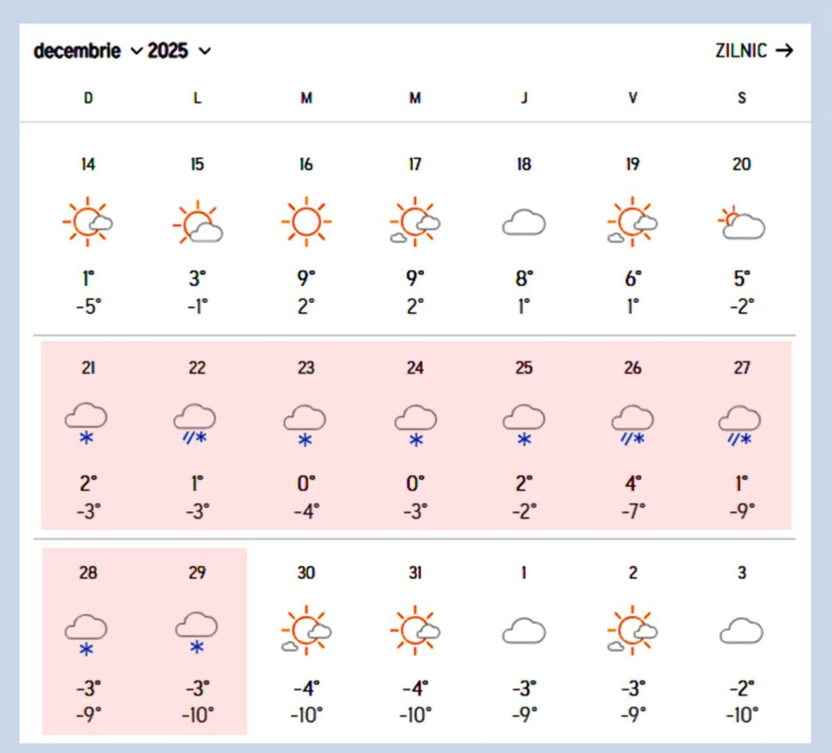 Potrivit meteorologilor, temperaturile maxime se vor situa între 2°C și -3°C, în timp ce minimele pot coborî până la -10°C în nopțile cele mai reci. După data de 30 decembrie, vremea se va stabiliza treptat, dar frigul se menține, cu valori termice diurne de aproximativ -4°C.