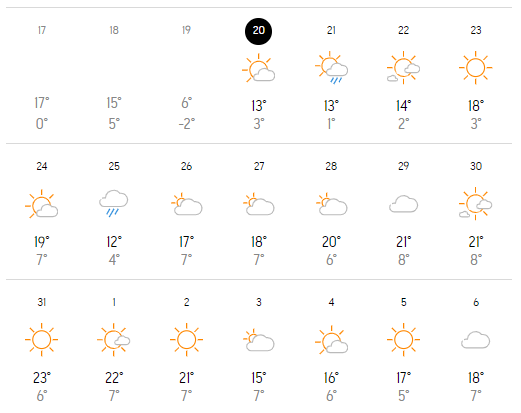 Accuweather prognozează temperaturi de până la 22 de grade în intervalul 6-12 mai 2024. În 13-19 mai 2024 temperaturile vor ajunge chiar și la 26 grade, în ziua de duminică.