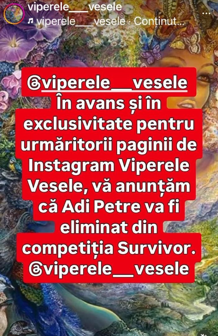 Survivor România 2026. Pagina de Instagram „Viperele Vesele”, cunoscută pentru spoilerele despre emisiunile de televiziune, a anunțat duminică, 22 februarie 2026, că Adrian Petre urmează să fie eliminat din competiția Survivor România, difuzată pe Antena 1.