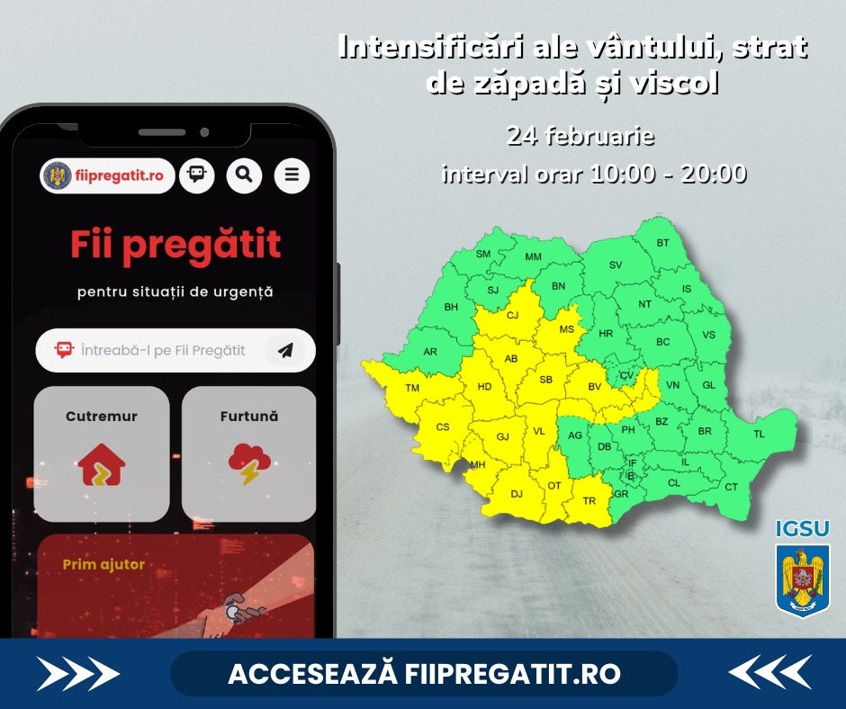Inspectoratul General pentru Situații de Urgență (IGSU) avertizează că marți, în intervalul 10:00–20:00, în Carpații Meridionali, Carpații de Curbură și local în Carpații Occidentali sunt așteptate ninsori viscolite, cu depuneri de zăpadă, vizibilitate redusă sub 100 de metri și intensificări ale vântului. De asemenea, vântul se va intensifica și în Banat, Oltenia, precum și local în Transilvania și în sud-vestul Muntenia, unde vitezele vor fi cuprinse între 50 și 70 km/h.
