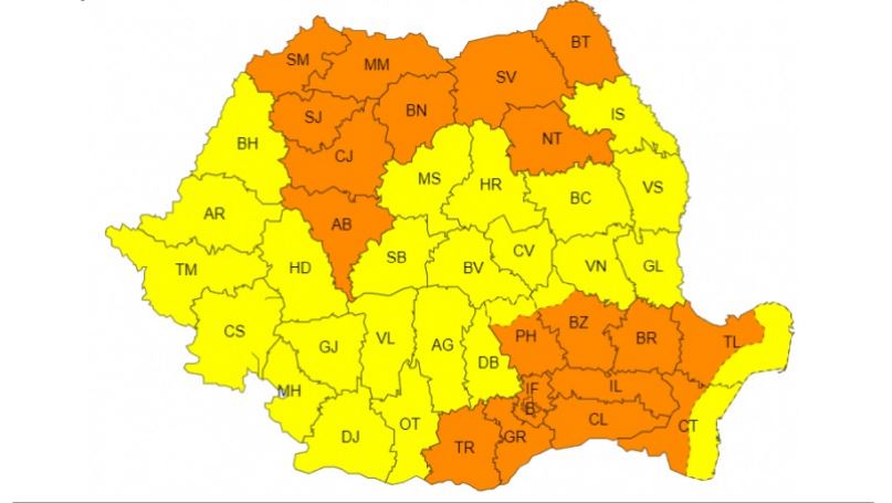 Aceste județe se vor afla sub avertizare Cod portocaliu, iar restul țării sub avertizare Cod galben.